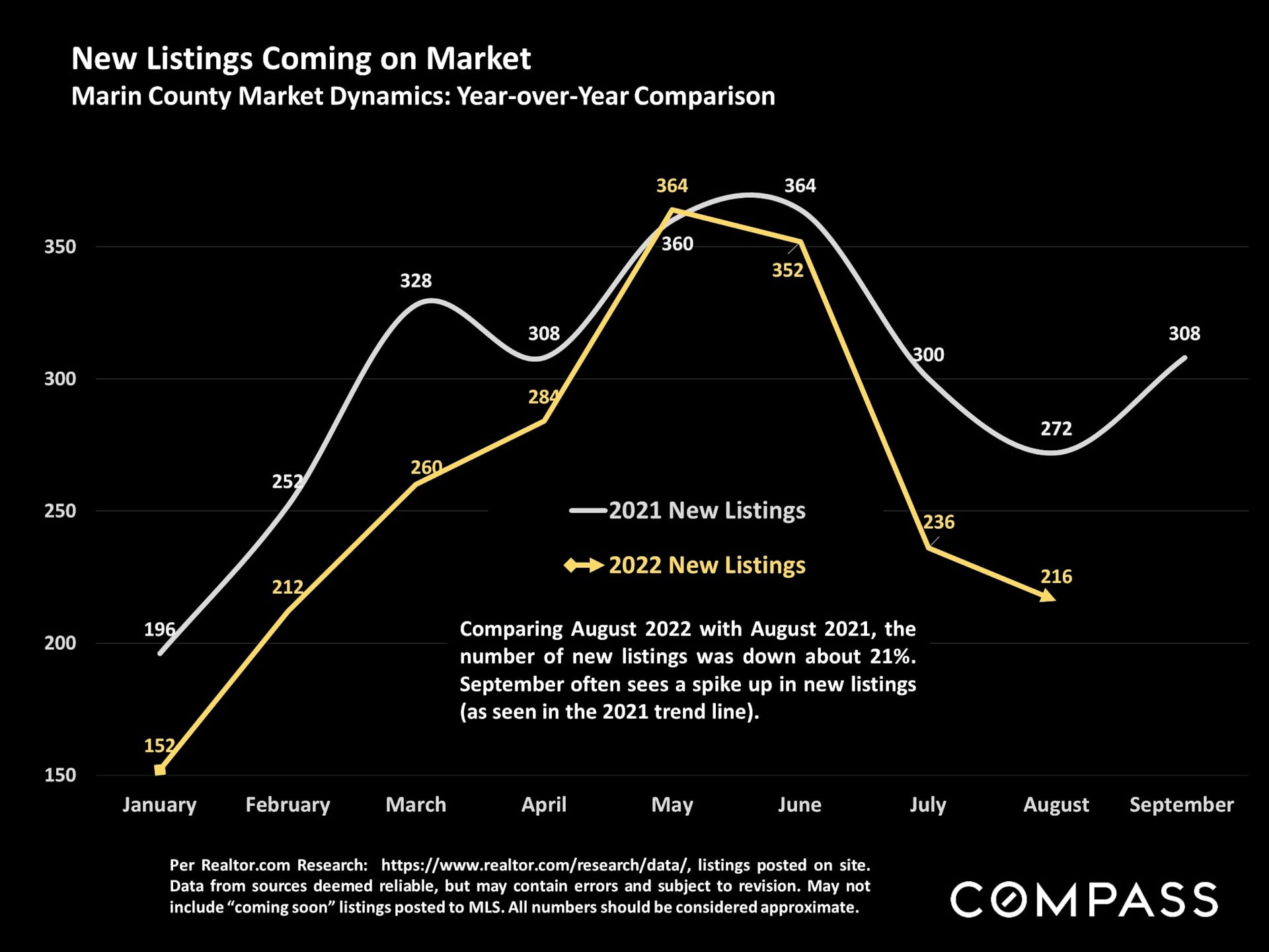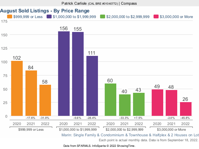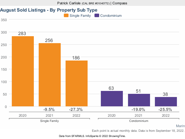 - The number of homes closing escrow in all Marin in August was down 27% year over year (25.5% for condos). We had 25% fewer going into contract. FYI, traditionally August is a vacation month and typically produces fewer sales, but the August 2022 drop is significant.
