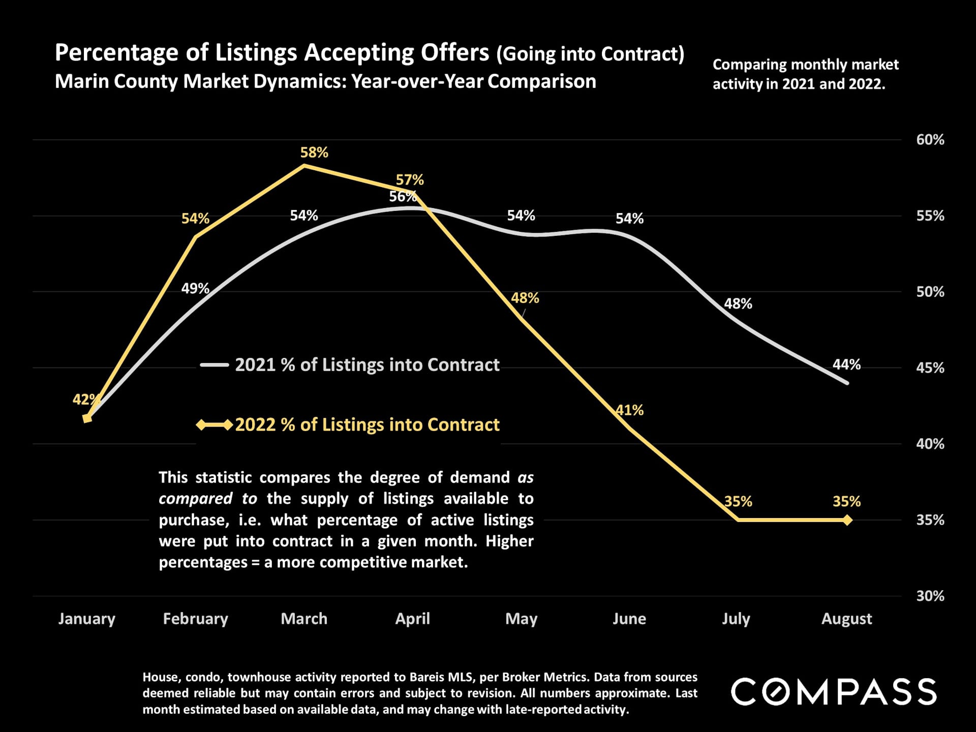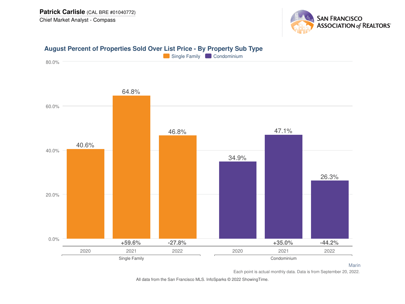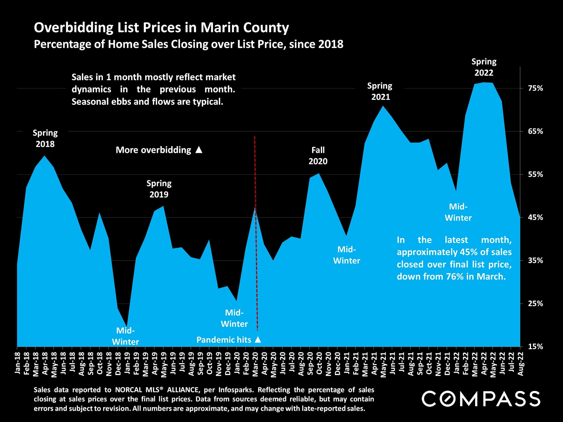 - Surprise: 45% of all sales in Marin did close escrow above asking price in August, compared to 76% in March 2022.