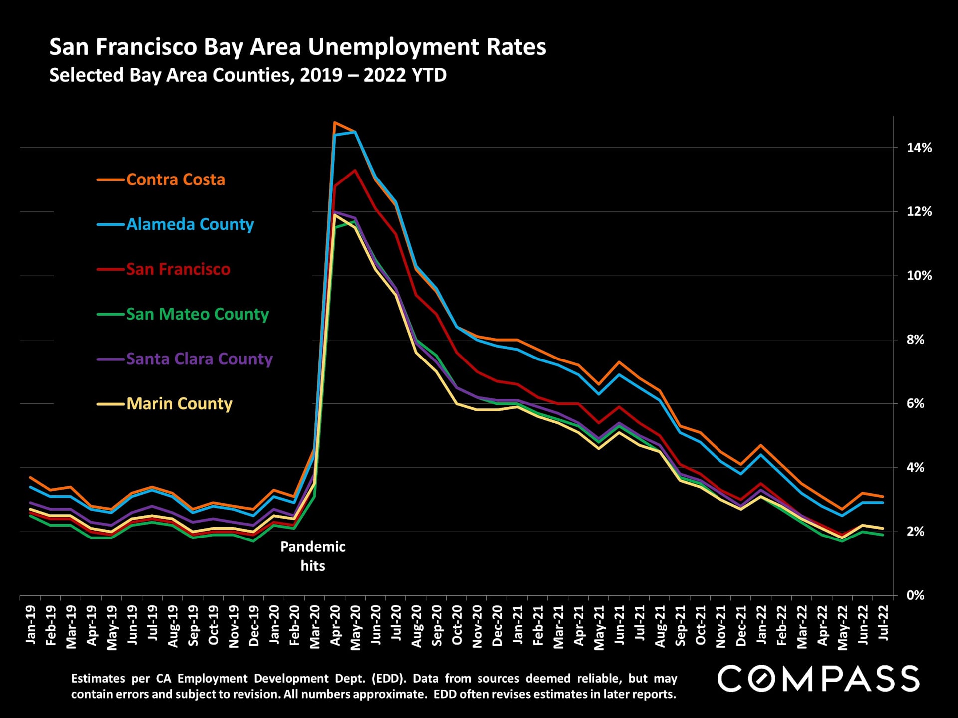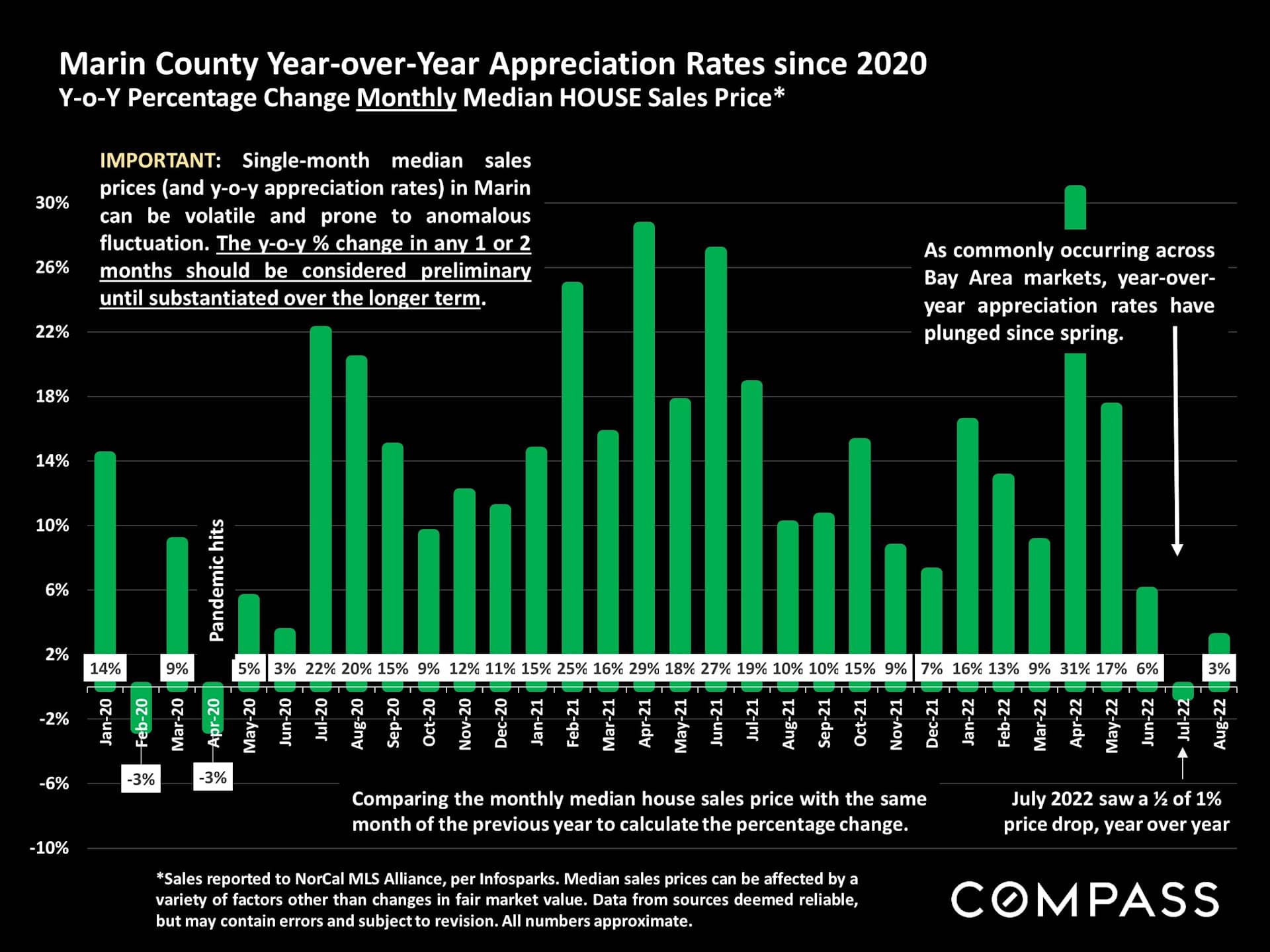 - Average Marin value appreciation rate in August is still up 3% year over year. The Bay Area overall is at -2% appreciation, although varies greatly by county and community.