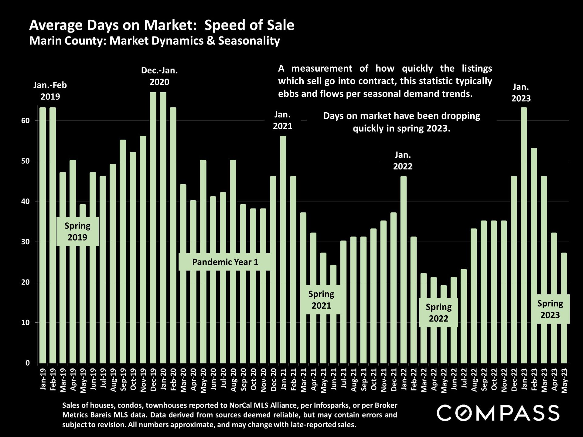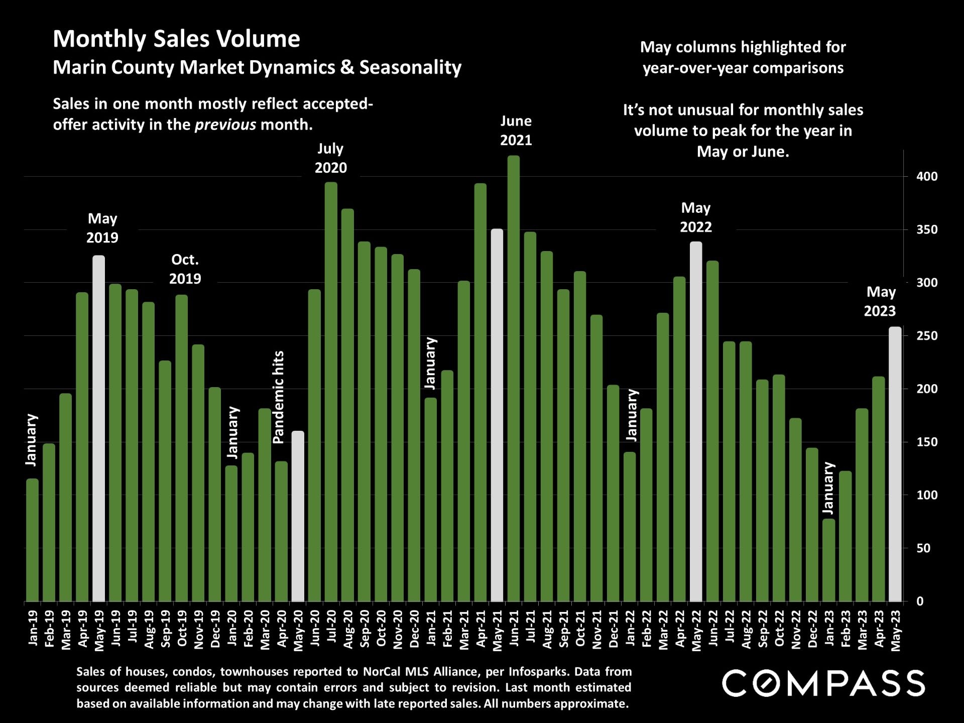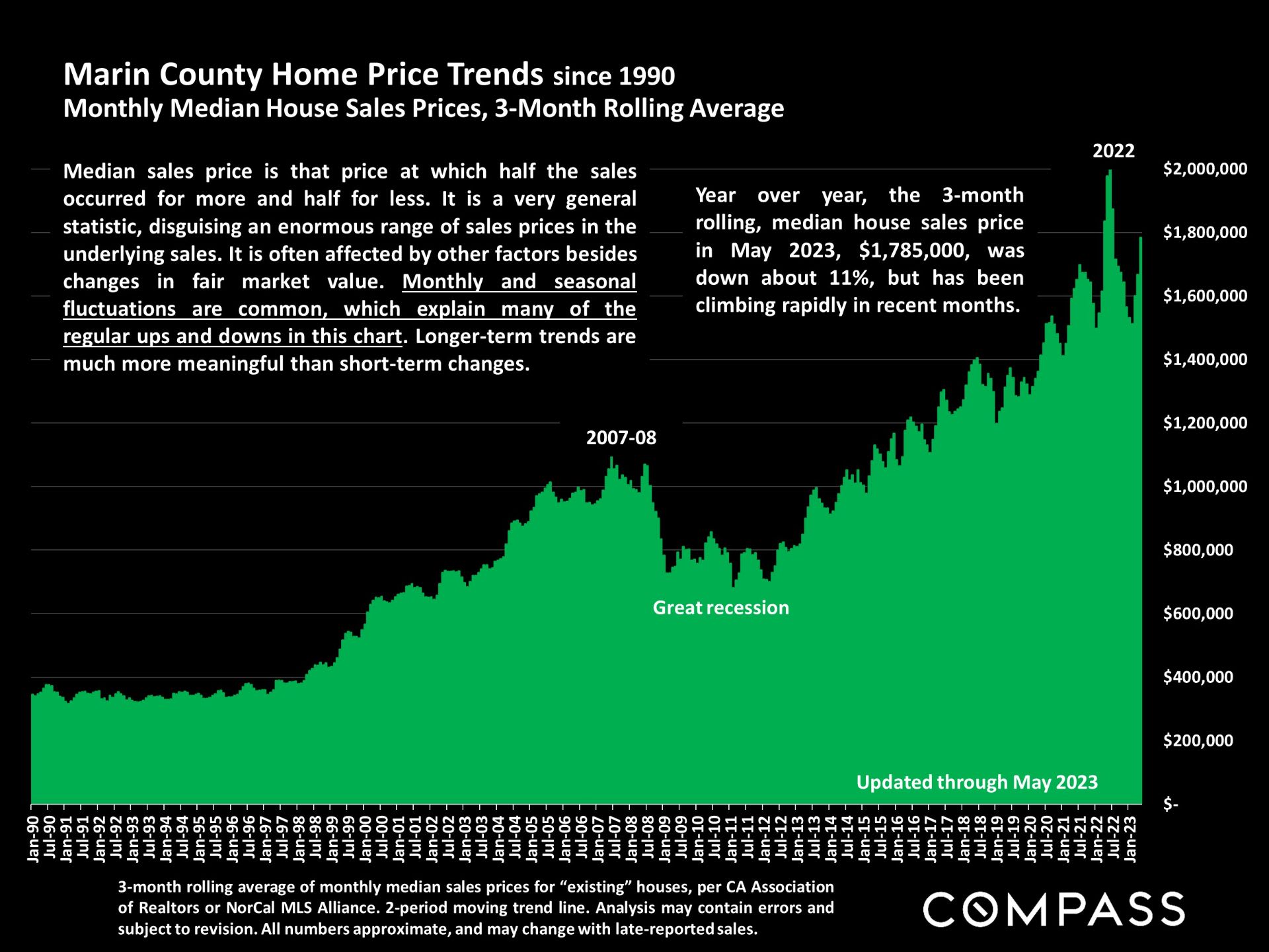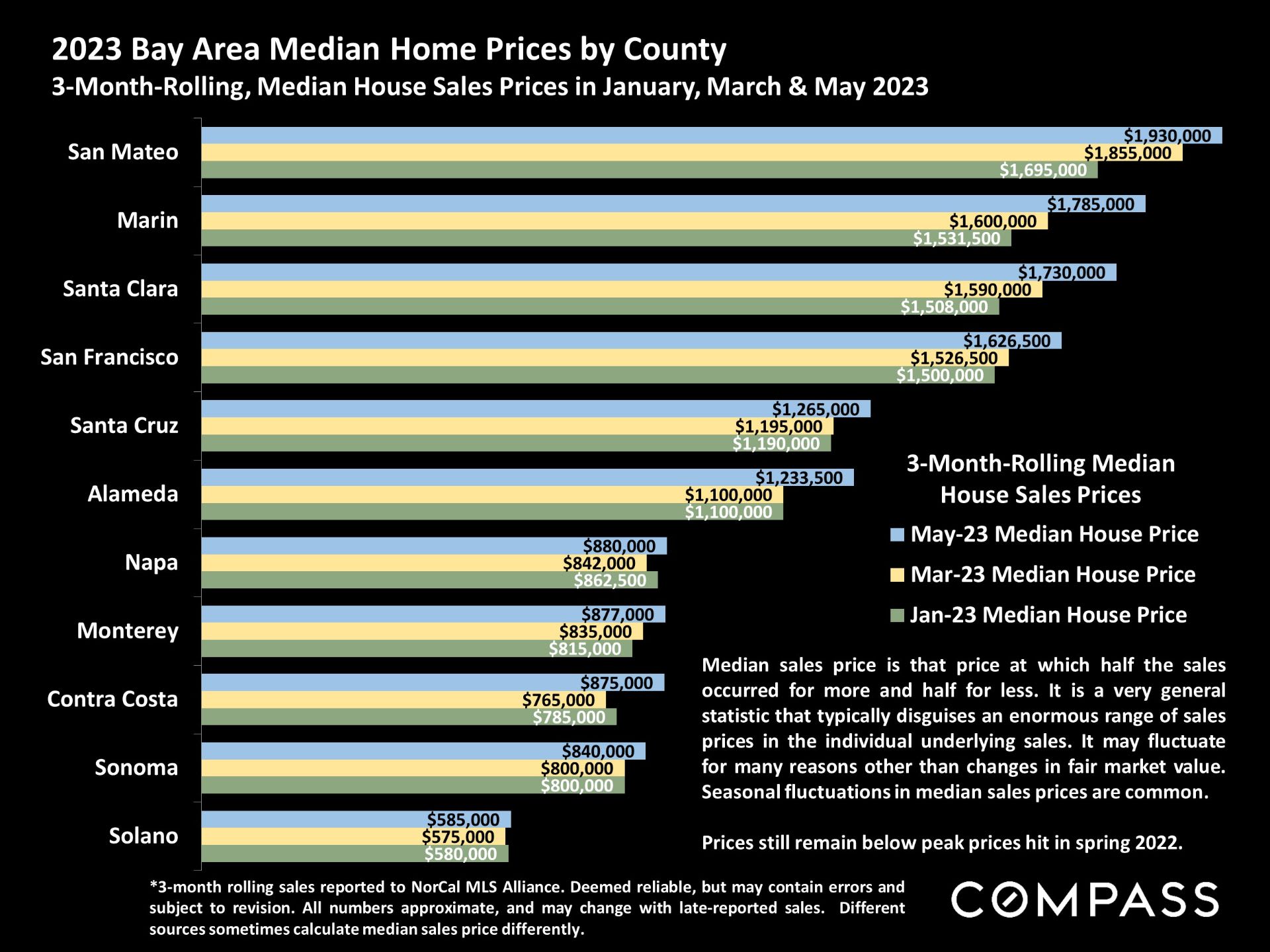 - Marin's median sales price in May rose to just under $1.8 million, from $1,675,000 in April. We rank #2 among all 11 Bay Area Counties.